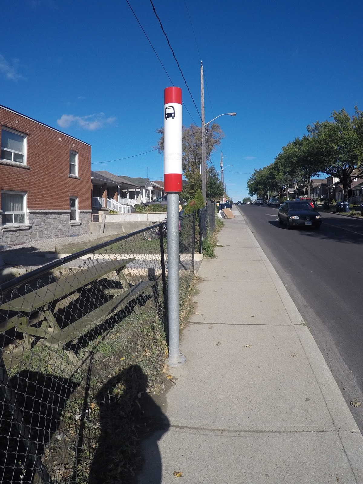 As paradas são bem simples, identificadas por um poste sinalizado branco e vermelho. Algumas estações também possuem uma cabine de vidro, bastante útil nos dias de frio!